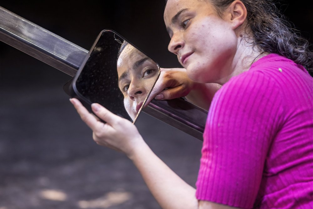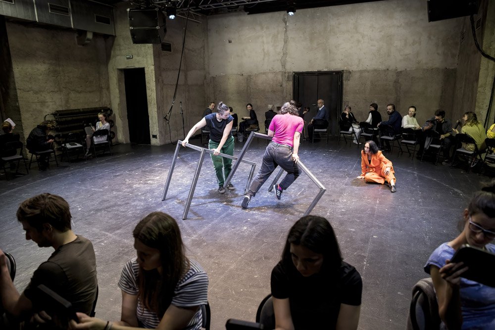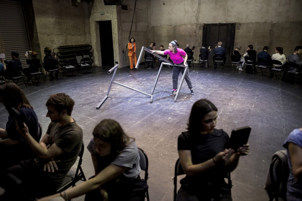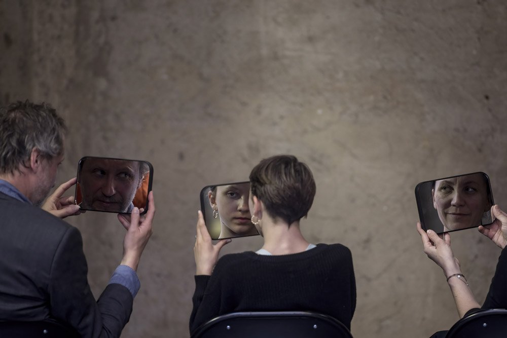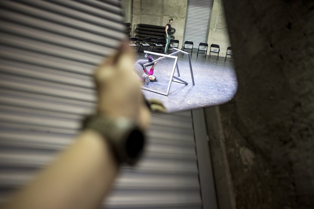 Kovové objekty, odrazy prostoru, těla, formace a deformace, narušení, úhel pohledu…Tlak, tah, rovnováha, skluz, zhup, náklon, šikma, váha, vzdálenost, řád, tensegrity… Vstupte s námi do jednoho prostoru. Dá se nalézt ten pravý úhel pohledu? Pro každého diváka vlastní individualizovaný výsek jevištní reality. Experimentální hra s vnímáním publika, které sedí zády ke scéně a vytváří si svůj úhel pohledu pomocí zrcátek.